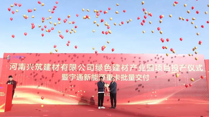 12月22日,河南兴筑建材有限公司绿色建材产业园项目投产仪式暨宇通新能源重卡批量交付活动隆重举行。宇通重卡副总经理兼营销中心总监郭梁出席活动并发表致辞,郭梁表示,在国家“双碳战略”的引领下,推动建筑材料产业的绿色发展,不仅对促进建筑行业改革、提升资源利用效率、