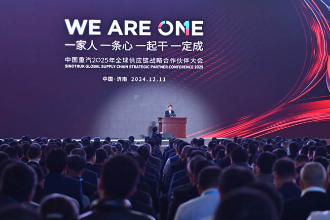 2024年12月11日,以“WE ARE ONE——一家人、一条心、一起干、一定成”为主题的中国重汽集团2025年全球供应链战略合作伙伴大会在山东济南成功举办。山东省委常委、济南市委书记刘强,山东重工集团党委书记、董事长满慎刚出席活动并致辞。会上,山东重工集团