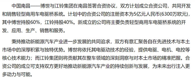 博世与江铃签约计划成立合资公司从事轻型商用车电驱动系统业务