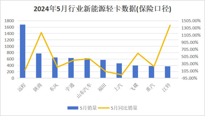 根据终端保险数据显示,2024年 5月,新能源轻卡销量 8772 辆,同比上涨 208.5%。在整体下行的市场环境下,新能源轻卡继续保持强劲领涨势头。在5月行业排名中,陕汽商用车异军突起,新能源轻卡单月销售达成775辆,一举夺得亚军之位,整体表现十分亮眼!在整