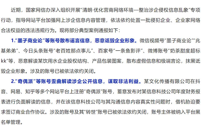 近期,国家网信办深入组织开展“清朗·优化营商网络环境—整治涉企侵权信息乱象”专项行动,指导网站平台加强网上涉企信息内容管理,依法依约处置一批侵犯企业、企业家网络合法权益的违法违规行为。现将部分典型案例通报如下:1.“墨子商业论”等账号散布谣言信息,恶意诋毁企业