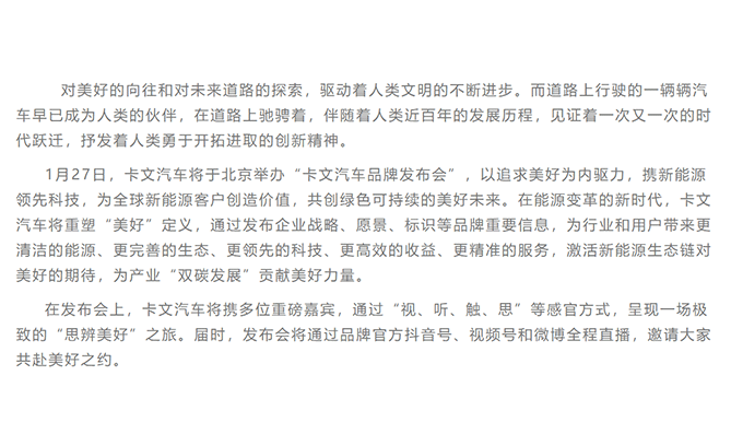 对美好的向往和对未来道路的探索,驱动着人类文明的不断进步。而道路上行驶的一辆辆汽车早已成为人类的伙伴,在道路上驰骋着,伴随着人类近百年的发展历程,见证着一次又一次的时代跃迁,抒发着人类勇于开拓进取的创新精神。1月27日,卡文汽车将于北京举办“卡文汽车品牌发布