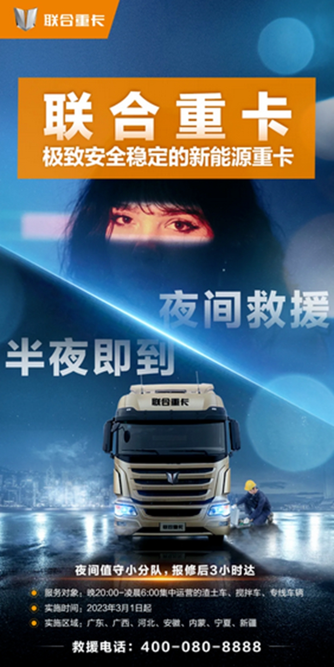 为此,联合重卡推出全新服务品牌——夜间救援  半夜即到,精准聚焦客户夜间运营时段的服务需求痛点,携手服务商成立夜间服务小分队,针对20:00至次日06:00时段运营的渣土车、搅拌车以及固定线路车辆,夜间救援快速响应。