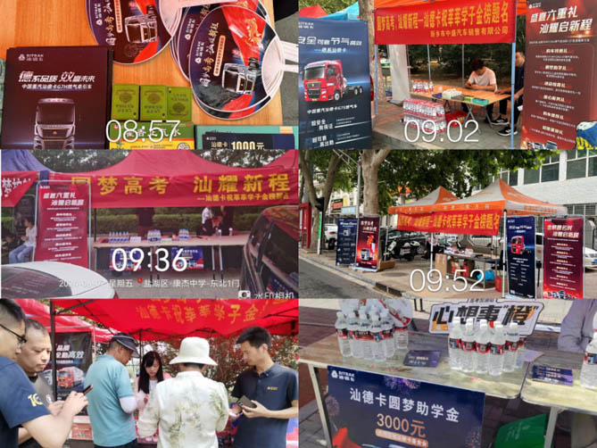 中国重汽汕德卡同样在高考期间为考生和家长送上关怀,在全国各地组建经销商服务队伍,深入考点一线,设立高考助考点,免费为考生及家长提供饮用水、药品等物资,为莘莘学子打造考场外的“温馨港湾”。