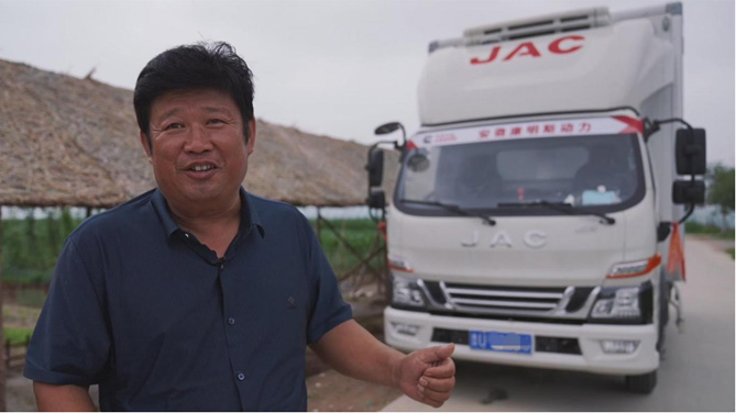 绿色农业是青岛的特色产品,位于青岛的平度市古岘镇一里村的孝里菜乡绿色农业专业合作社是一处网红地,曾多次登上过青岛市民的热搜榜单。该合作社社员主要由当地三个村的村民组成,共有100多户,日常种植、销售各类果蔬菜品等。社员郭绍兴即是当地合作社的一员,也是一名江淮1卡骏铃的绿通卡友,负责将孝里的新鲜蔬菜瓜果运送出去,他性情豪爽,热爱唱歌,每天都用歌声开启运输之旅。
