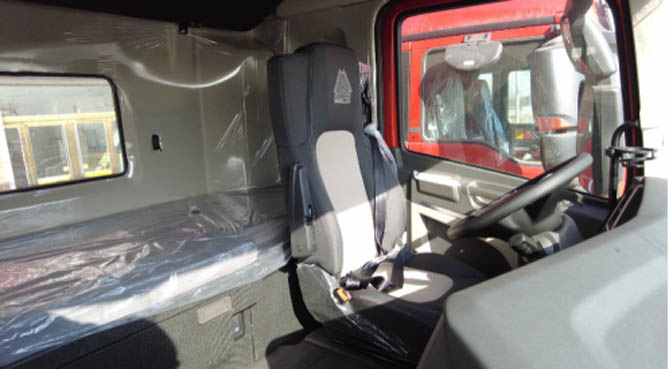 豪沃TX7燃气车驾驶室应用的是高品质轿乘式内饰,多功能方向盘和四方位影像大屏。室内采用阻尼板、隔热板等材料,使怠速噪音可以降至52分贝以下。同时舱高1925mm,可以方便卡友们自如地在车内活动。