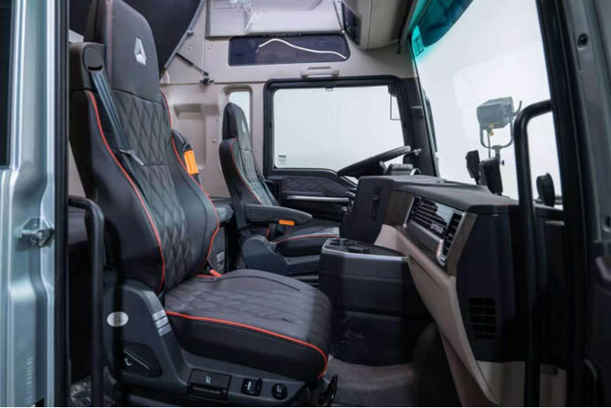 南师傅常年奔波于青海与广州之间,这条单程长达3000公里的运营路线见证了他的不懈奔波。在漫长而艰辛的运输途中,他勤勉尽责,从未懈怠。可长年运输久坐,让他的职业病不断复发。因此南师傅在选择车辆时,舒适性是他首要的考量因素。汕德卡G7H 630燃气车采用超高顶和平地板设计,驾驶员可以在内部直立行走,减少了长时间驾驶的压抑感;主驾座椅采用了航空座椅设计,为卡友提供了更为舒适的乘坐体验,有效缓解长途驾驶的疲劳感;车辆配备1米超宽卧铺、12.3寸智能语音交互中控屏等至尊舒适内饰和丰富配置,让他在长途驾驶后能够得到充分的休息和放松,有效缓解长途驾驶的疲劳感,以饱满的精神状态迎接每一次启程。