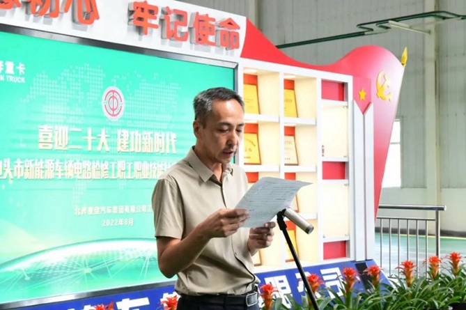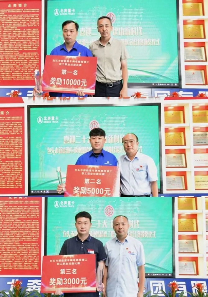 为进一步落实内蒙古自治区和兵器工业集团签署的战略合作协议,助力包头市换电试点城市和氢燃料电池示范群城市建设,8月12日-13日,由包头市总工会主办、北奔重汽工会承办的包头市新能源车辆电路检修工职工职业技能比赛在北奔重汽总装公司举办。8月17日上午举行现场颁奖仪式,包头市总工会经审委员会主任、四级调研员殷枢衡,公司党委副书记、纪委书记、工会主席李云峰,公司总工艺师、总质量师、总装公司经理管海峰等相关单位领导、参赛选手、裁判员参加颁奖仪式。