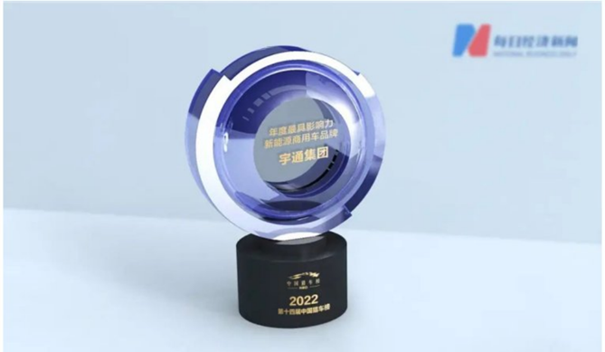 2022年12月23日,由《每日经济新闻》主办的“第十四届中国猎车榜”,宇通集团荣获“2022年度最具影响力新能源商用车品牌”。