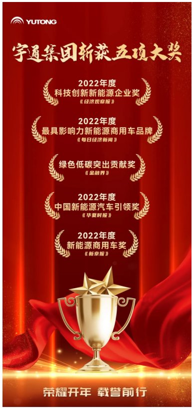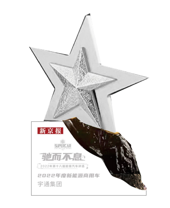 2023年1月11日,由《新京报》主办的“驰而不息”2022年第十八届超级汽车评选揭晓获奖名单,宇通集团荣获“2022年度新能源商用车奖”。