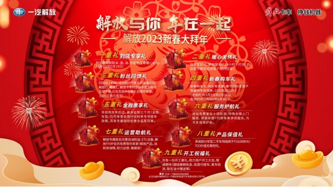 “解放与你 年在一起!”九重大礼将新年氛围感拉满,涵盖购车、用车、养车各个环节,优惠、红包及各种新春礼包等你来拿,无论你走到哪里,都能够感受到来自解放的温暖。
