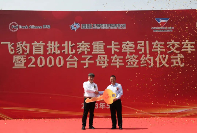 2023年5月27日,中铁飞豹首批北奔牵引车交车暨2000台子母车签约仪式在北奔重汽创新研究院内举行。此次仪式的成功举办是北奔重汽与中铁飞豹、所托瑞安、满帮集团、敏思达等合作伙伴强强联合,充分发挥各自在技术、资源、信息等方面优势,共同谋划,推动产业链协同,为地方经济和物流行业的高质量发展贡献力量。