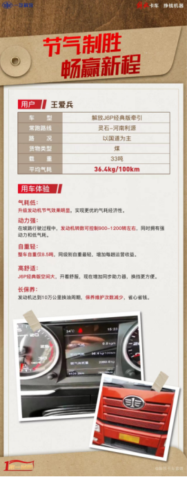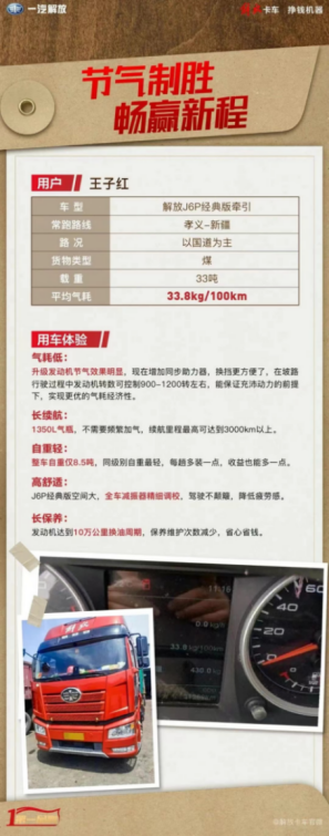 王子红是一名经验丰富的卡车司机,他新购入的解放J6P经典版LNG牵引车,动力强劲,加速迅猛,让他竖起大拇指,频频称赞。他驾驶着这台车来往于山西孝义和新疆一带运煤,线路以国道为主。日常载重约33吨,平均气耗为33.8kg/100km。超低的气耗得益于解放全新升级的发动机,在坡路行驶过程中,发动机转数可控制在900-1200转左右,能够保证充沛动力的前提下,实现更优的气耗经济性。