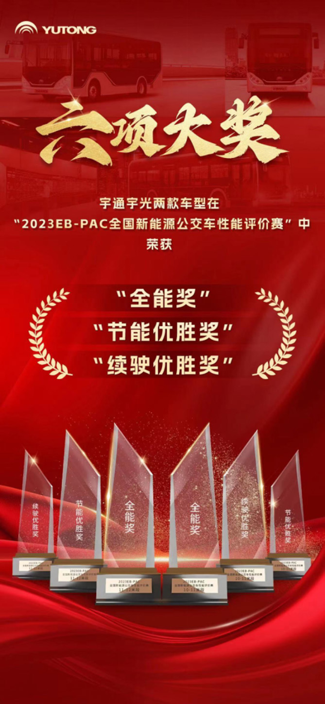 近日,“2023EB-PAC全国新能源公交车性能评价赛”在重庆成功举办,经过3天的激烈角逐,最终,6家企业11款车型获得奖项。宇通携10.5米和12米宇光造型纯电动公交车参赛,两款车型分别在10-11米和11-12米段的比赛中斩获“全能奖”“节能优胜奖”和“续驶优胜奖”全部六项大奖,成功实现大满贯。