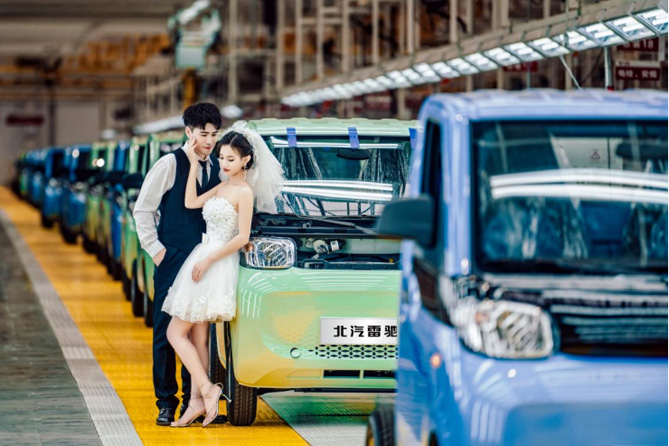 在几组新人发布的婚纱大片中,北汽雷驰新能源MINI卡集潮玩、时尚、科幻于一体。