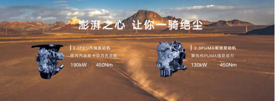 敢探者提供2.3T FEU汽油发动机和第五代2.3T PUMA柴油发动机两种动力选择,汽油发动机峰值功扭190千瓦/450牛米,柴油发动机峰值功扭130千瓦/450牛米,动力性能强劲。