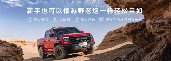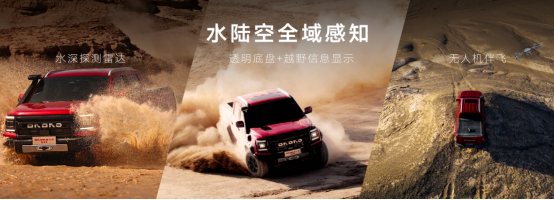 32°接近角,27°离去角,255mm离地间隙,285全地形越野胎和7种不同模式的全地形管理系统,并且高配版本还有8档阻尼可调氮减,更使敢探者具备全地域的适应能力。而敢探者还拥有蠕行模式、蠕行掉头、博格华纳分时四驱系统等众多越野利器,为用户带来更轻松、更畅快的越野乐趣。行业首搭的无人机伴飞技术,不仅能够更好掌握前方未知路况,同时还能以俯瞰的视角将沿途美景尽收眼底。
