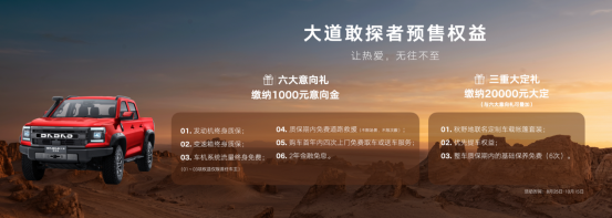 现在参与订购,能够享受意向礼和大定礼两种用户权益。 线上缴纳 1000 元意向金的用户,可享受六大意向礼:首任车主发动机终身质保、首任车主变速箱终身质保、首任车主车机系统流量终身免费、质保期内免费道路救援、购车首年内四次上门取车或送车服务及两年金融免息政策。线上缴纳2万元定金用户,将在六大意向礼上再升级,更享秋野地联名定制车载帐篷套装、整车质保期内基础保养免费(6次)、优先提车权,三重大定豪礼。