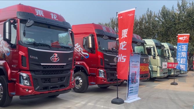 乘龙将活动现场布置成了一个拍照打卡胜地,乘龙明星产品——乘龙H5超轻版2.0 LNG牵引车及系列热销车型悉数亮相,乘龙家族帅气的外观吸引众多卡友纷纷驻足拍照。