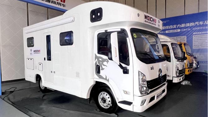 蓝擎·龙旅居车作为潍柴商用车展台的颜值担当也吸引了众多观众的目光。不仅是外观造型美观,其驾驶室采用一次成型玻璃钢模具制作,更低的风阻能带来更低的油耗表现;房车内部布局了三张大床,可满足六口之家外出,橱柜、餐桌集成可折叠设计,使利用空间更宽敞;在其他配置上,也可根据客户需求,选装空调、车载冰箱、电视、饮水机、发电机组水箱等生活设备。