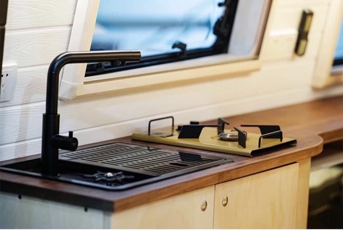 厨房区域含有一字型组合式橱柜、厨房吊柜、野营式桌面燃气灶和微波炉,可选装净水箱60L+灰水箱30L,鹅颈式水龙头+带盖水池+洗杯器,各种设施一应俱全,生鲜蔬果、餐具用品洗涤方便,让您无论何时何地,都能品尝到家的美味。