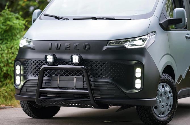 作为依维柯家族的全新产品,依维柯聚星系列以突破传统的未来科技设计语言,打造个性十足的“有维新青年”。聚星B型露营居旅车,以战舰灰与哑光黑为主基调,搭配断点纹路,酷炫至极。车头前牛栏杆与远光聚焦射灯搭配车顶泛光铺路灯的设计,像一只威严的野兽,使整车多了一份野性之美。