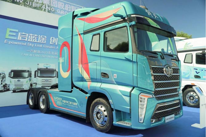 新能源卡车方面,一汽解放瞄准快递快运等高效干线物流市场,打造的J7创领自主燃电牵引车绝对是“主角”。该车搭载自主双电驱桥和自主100kWh动力电池,自主150kW燃料电池系统,充分满足车辆动力性能要求。搭载70MPa高压储氢系统,无需频繁加氢,提高了运输效率,整车续驶里程大于600公里,有效解决新能源里程焦虑问题,是可靠、安全、舒适、节能的优秀干线物流产品。