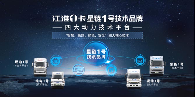 “星链”是江淮1卡擘画未来的重要载体,“1号”是江淮1卡始终如一的发展目标。“星链1号”技术品牌,是中国商用车行业首个全场景高智技术品牌,由“燃油、混动、纯电、氢能”四大技术平台组成,具有“智慧、高效、绿色、安全”四大核心技术,正应日益蓬勃却也亟待升级的轻型物流运输行业而生,向新能源化、智能化全面进阶。
