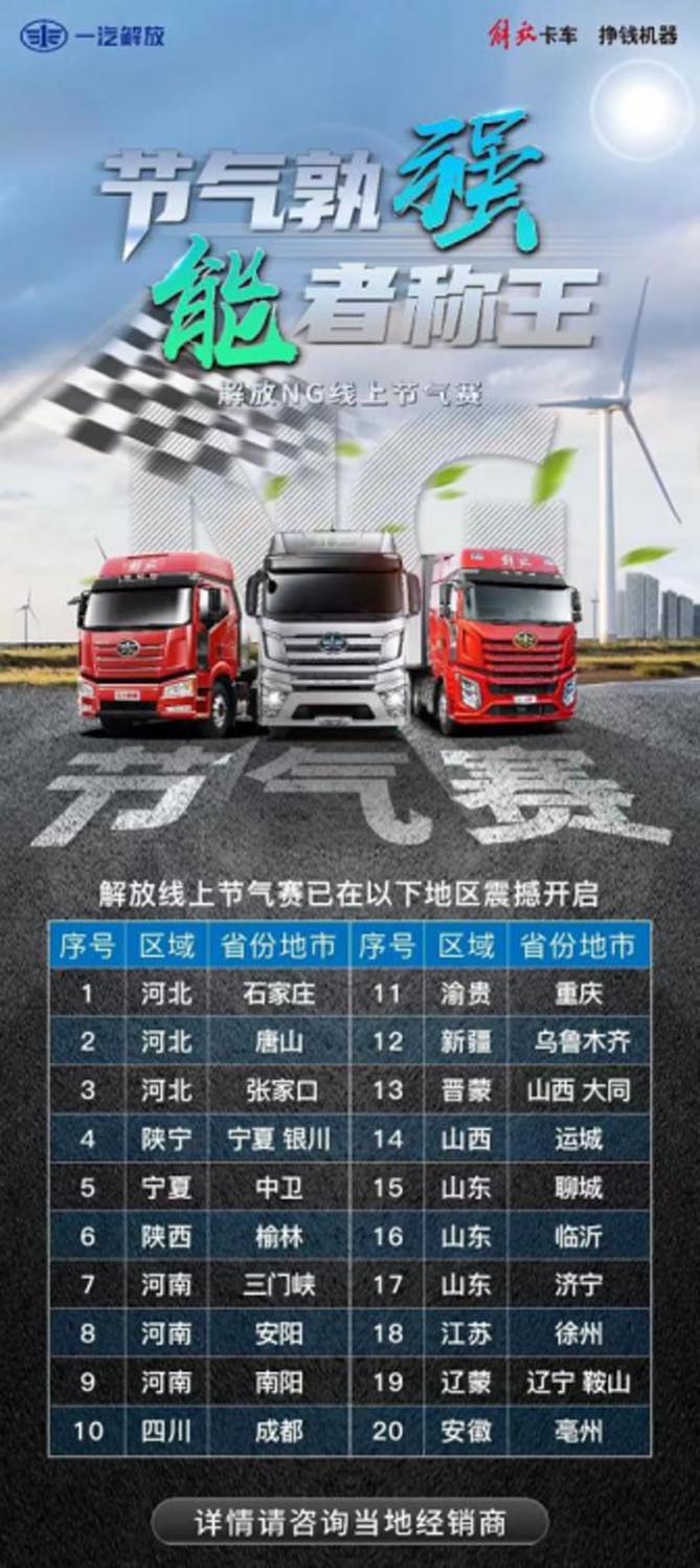 为了紧跟市场的需求变化,帮助用户在“节气”道路上持续挖潜,一汽解放融合了时下行业热点,打造了“线上节气赛”。目前,解放“线上节气赛”已遍及石家庄、成都、重庆、大同、济宁、银川、乌鲁木齐等20余座城市(详情咨询当地解放经销商)。赛事的灵活性使得NG用户运营、赛事两不误,吸引广大卡友参与挑战。