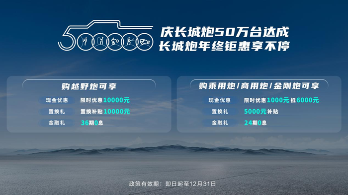 同时,即日起至12月31日,购买越野炮,尊享限时优惠10000元、置换补贴10000元、金融贴息36期0息等超值优惠;购买乘用炮、商用炮、金刚炮,尊享限时优惠1000元抵6000元、置换补贴5000元、金融贴息24期0息等钜惠福利;弹系列产品也带来多重优惠福利,为用户准备了丰厚的超值大礼包。长城炮以满满诚意,让更多用户体验到皮卡带来的出行乐趣,也坚持以品类创新持续推动皮卡市场扩容。