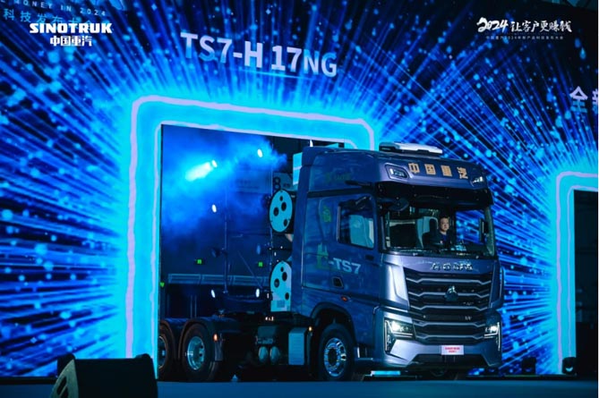 燃气车方面,中国重汽豪沃TS7-H牵引车作为一款高效干线物流超高顶重卡成展会亮点。车辆搭载54.16%高热效平台定制版WP17NG燃气发动机,700马力超强动力+S-IEC燃气智控技术+无极S动力链一体开发+智能动力域控制+超低风阻等体系化节气措施,百公里节气2-3kg,以极致科技打造爆赚的实力;国内首次采用顶盖辅助远光灯设计,点亮极致安全旅途;车辆采用超高顶平地板设计,内高达到2200mm的行业之最;1100mm抽拉卧铺,48分贝静谧,打造顶级座舱。