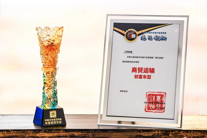 江铃凯运+连续斩获三项大奖:在11月16日由《My车轱辘》新媒体矩阵主办的第九届中国汽车“金轱辘奖”颁奖盛典中获“年度轻卡”奖;在12月26日由《方得网》主办的第七届“寻找车极限”颁奖典礼上获“蓝牌轻卡城配物流之王(2023)”称号;在12月27日,由《卡车之友网》主办的 “第七届中国卡车客户运营调查意见领袖颁奖盛典”中获“城配运输创富车型”。同时,全新江铃凯威在第七届“意见领袖”颁奖盛典中荣获“商贸运输创富车型”。