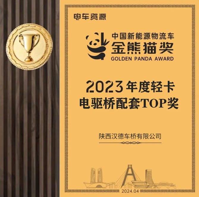 在本次产业大会颁奖盛典上,汉德车桥荣获中国新能源物流车“金熊猫奖”2023年度轻卡电驱桥配套TOP奖,载誉而归,以实力和品质赢得用户信赖!