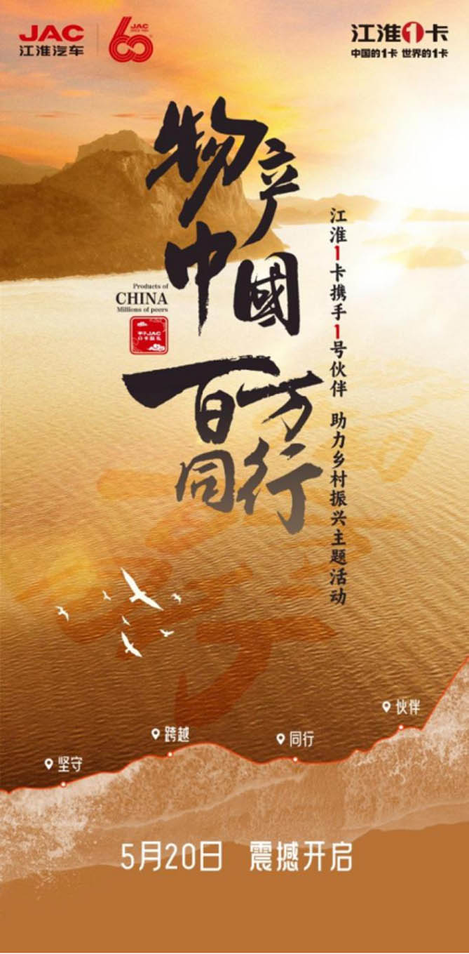 5月20日,不仅是表达爱与情感的日子,更是江汽集团砥砺前行60载的厂庆纪念日,献礼60周年 助力乡村振兴。“物产中国 百万同行”江淮1卡携手1号伙伴 助力乡村振兴主题活动,首站活动将于5月20日震撼启动。