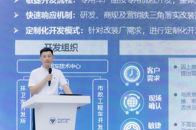 在追求卓越的道路上,准备充分是先决条件。会议伊始,时代事业部技术研究院专用车技术中心主任梁勋乾,以《福田时代专底重点产品推介》为题,从研发策略和产品规划两大方面深入剖析了福田时代专底的技术精髓。他强调,福田时代专底不仅深耕技术领域,更将底盘技术视为核心竞争力。通过专职开发组织、敏捷开发流程、快速响应机制、定制化开发模式这四大策略同步进行。在产品规划方面,福田时代专底将重点发展环卫车、冷藏车,专业运输车等,并以新能源为着重点进行产品研发,为合作伙伴量身定制高效且个性化的解决方案,共同开创美好未来。