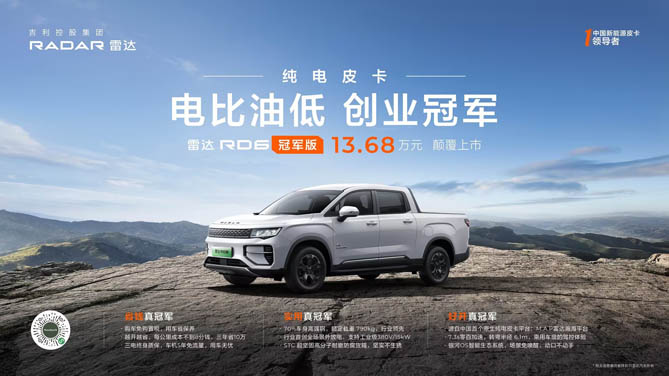 打造场景化的用车体验,是吉利雷达的核心竞争力之一。日前,吉利雷达还正式推出了雷达RD6冠军版,冠军版车型拥有省钱、好开、实用的“冠军实力”,定价则为13.68万元,作为行业内首个实现“电比油低”的皮卡,极其强势的杀入了传统皮卡主流市场价格区间,打破了传统皮卡最后的价格优势,同样实现了“电比油好”,在不同竞争维度下都占据了明显优势,为中小企业主日常的工作和生活带来了极大的便利。