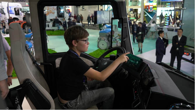 展区内,不仅展示了中国重汽最新一代的高效节能、智能互联商用车,还巧妙融入了家庭互动元素,让大小朋友们在探索中感受中国商用车汽车文化的深厚底蕴与未来科技的无限可能。小朋友们兴奋地围绕在黄河氢内燃机牵引列车、汕德卡氢燃料电池牵引车等展车周围,通过驾驶室体验商用车的乐趣,而家长们则在一旁欣赏中国重汽如何将精湛科技应用与当今主流的环保理念完美融合,共同绘制了一幅工业艺术与家庭温馨交织的美好图景。