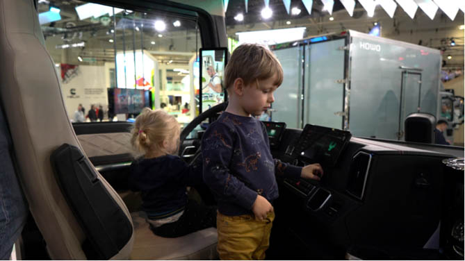 据悉,2024 年IAA主办方在传统的展会形式上进行丰富包装。21日和22日的周末展会,除了以商用车展为聚焦点外,还将目光投射到驾驶者与家庭的人文意义上,烘托出周末家庭观展日的概念。在现场,有不少观展者以家庭为单位驻足中国重汽展台,欣赏充满魅力的东方美学,成为了众多德国家庭亲子时光中的一抹亮色。