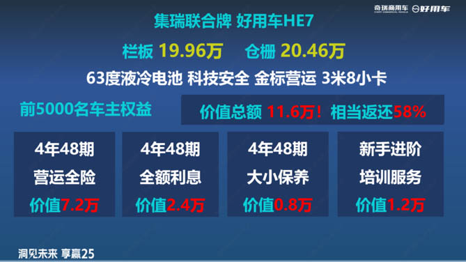 更令人惊喜的是,好用车在发布会上宣布,前5000名购车车主将享受价值11.6万元的专属权益,包括48期营运全险、48期金融贴息、48期大小保养和新手进阶营运的专属培训服务。这是行业首个将4年主要TCO成本(包括营运保险、利息、保养等)纳入车价的新品发布会,真正实现了“货真价实”。选择好用车HE7的消费者在4年期间只需承担充电、停车等少数费用,即可安心从事城配工作。