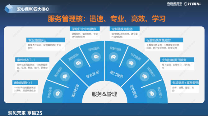 针对当前新能源物流车保险购买难、保费贵等行业痛点,好用车联合生态伙伴推出了“安心保80”保险生态产品。该产品的目标是把保险赔付降到80%以下,通过大数据驱动、服务管理、硬件防护、科技交互等手段降低营运车出险率、赔付率,从而降低保险赔付金额,实现降保费、低出险、低赔付的正向循环。