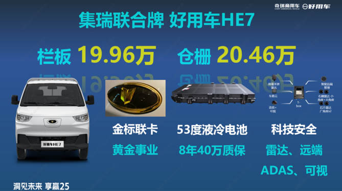 好用车HE7依托开瑞KQ5平台,由集瑞联合卡车出品,该平台以高承载、高成熟度而著称。作为3.8米货箱原生纯电平台,好用车HE7在性能与品质上均达到了行业领先水平。为了满足营运车客户的差异化需求,好用车HE7还搭载了开瑞62.98度液冷电池,并配备了保险风险减量科技配置和保险安全管理平台。