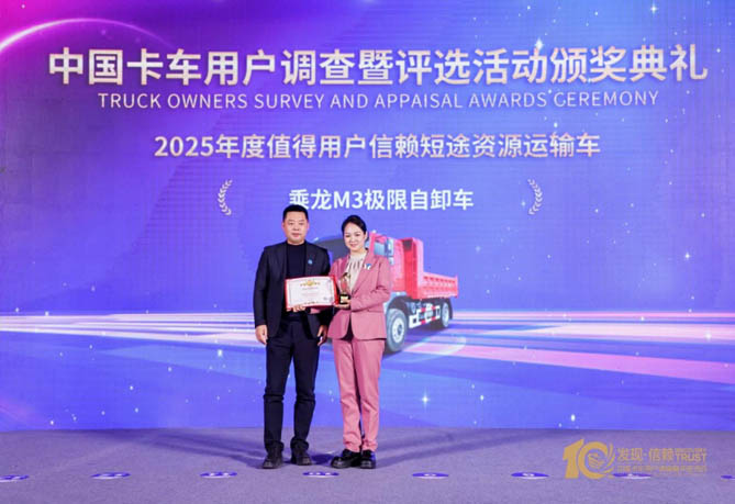其中乘龙M3极限自卸车以“高效、可靠、质优”等优势摘得“2025年度值得用户信赖 短途资源运输车”奖项,用实力证明其“极限”性能。