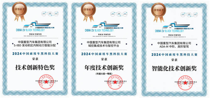 2024年中国重汽持续加大对创新技术领域的研发投入,不仅以最具竞争力的姿态领跑市场,更在科技创新与智能化等方面取得丰硕成果,成为行业瞩目的焦点。在2024中国商用车黑科技大赛颁奖盛典暨商用车技术大会上,中国重汽一举斩获三项重要奖项。其中,域控集成技术与智控平台凭借对物流行业数字化需求的精准把握,荣获“年度技术创新奖”,为物流运输领域的数字化转型提供了强有力的技术支撑。ADA-M中介与高阶智驾技术在智驾领域取得了突破性的进展,将“智能化技术创新奖”收入囊中,这一奖项不仅是对中国重汽研发成果的坚定认可,更是对其在推动行业智能化进程中所作贡献的高度肯定。S-IBD发动机缸内制动力智能分配技术——领先同级的高效安全科技,以创新驱动产业变革,“技术创新特色奖”实至名归,为商用车行业的安全、高效发展树立了新标杆。这一项项荣誉如同璀璨星辰,不仅照亮了中国重汽奋勇前行的道路,更将成为其勇攀高峰、再创辉煌的强劲动力。