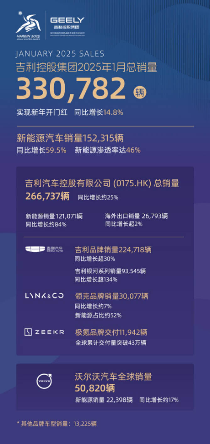 1月,吉利控股集团总销量330,782辆,同比增长14.8%。其中,新能源销量152,315辆,同比增长59.5%,新能源渗透率46%。2025开年,吉利控股延续稳健增长态势,实现开门红。