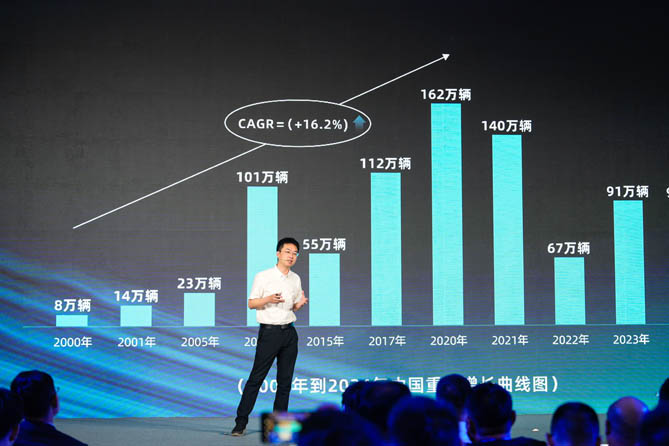会议现场,零一汽车创始人、COO张伟向客户、经销商及合作伙伴描述了新能源重卡市场的巨大机遇。他指出,自2017年国务院发布《促进汽车动力电池产业发展行动方案》以来,新能源重卡行业便迎来爆发式增长。2024年,新能源重卡销量从2021年的1万辆跃升至8.2万辆,净增长达7.2万辆。2025年,新能源重卡开局良好,全年有望达到14万辆规模,渗透率进一步升至20%。到2030年,新能源重卡渗透率有望达到50%,年销量达40万辆。