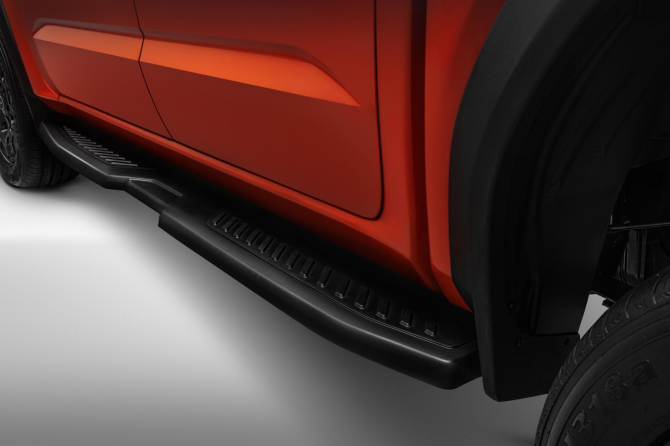 传统皮卡车型的上下车踏板设计,往往在实用性和细节上有所欠缺:要么宽度不足导致踩空风险,装卸货时缺乏攀爬支点,只能踩轮胎或后保险杠,存在一定安全隐患。对比同级车型,威麟R08采用2206×168×100mm的加大侧踏板,面积比同级车型有所提升,不仅成为车身美学的延伸,更化作前后排上车时稳健的“台阶”。