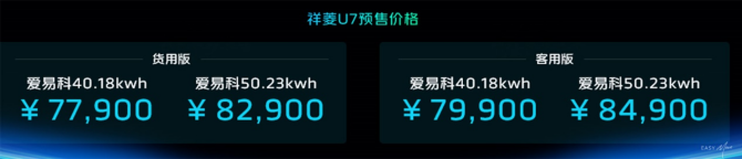祥菱U7拥有货用、客用两大版本,均配备40.18kWh和50.23kWh产品可供选择,售价7.79万元起。除了亲民的价格,10月31日前购车,还可享受两重好礼:金融礼,2年7万贷款免息,价值3500元。服务礼,免费赠送2年全包服务,2年内免费后桥保养、冷却液及制动液更换、电机减速器润滑油保养、工时及四轮定位,价值2000元。此外,凡购买爱易科电池车型,首任车主享终身免费质保。