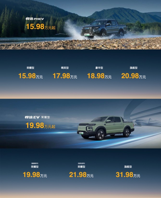 千钧之势,敢纵山河!全球首款千扭电混皮卡——悍途PHEV基于江汽集团自主研发的“H-Power”悍行超级电混架构打造,拥有“超级电混、五星安全、全域场景”等核心价值,市场指导价为15.98万元-20.98万元,上市期间购车可享订车礼,限时下订1000元抵3000元;焕新礼,增换购补贴至高10000元;质保礼,电池电机5年/20万公里、电控8年/20万公里;畅联礼,基础流量终身免费,娱乐流量3年免费(每月3GB)。同步上市的国内首款非承载式纯电四驱皮卡——悍途EV,市场指导价为19.98万元-31.98万元,上市期间购车可享订车礼,限时下订1000元抵3000元;质保礼,电池8年/40万公里、电机电控5年/20万公里;畅联礼,基础+娱乐流量终身免费(每月3GB)。