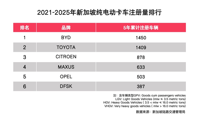 在电动卡车领域,比亚迪于2020年进入新加坡,开始向当地正式交付环卫车T9,成为当地第一家销售电动卡车的公司。2021年-2025年,比亚迪纯电卡车在新加坡五年累计注册量达1450台,排行第一。