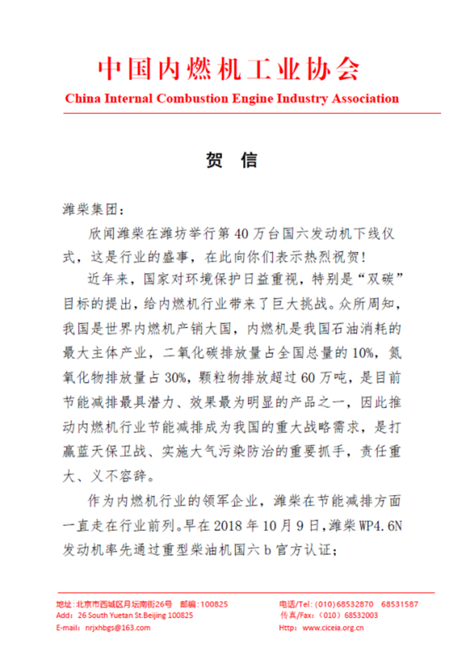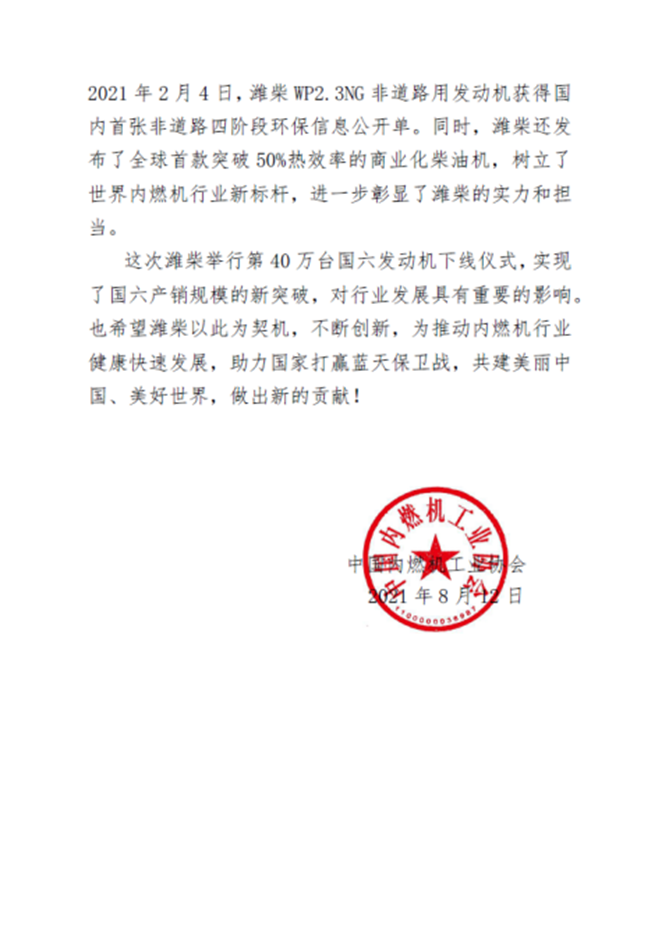 中国内燃机工业协会在贺信中说,作为内燃机行业的领军企业,潍柴在节能减排方面一直走在行业前列。2018年10月9日,潍柴WP4.6N发动机率先通过重型柴油机国六b官方认证;2021年2月4日,潍柴WP2.3NG非道路用发动机获得国内首张非道路四阶段环保信息公开单。2020年9月16日,潍柴发布了全球首款本体突破50%热效率的商业化柴油机,树立了世界内燃机行业新标杆,进一步彰显了潍柴的实力和担当。潍柴举行第40万台国六发动机下线仪式,实现了国六产销规模的新突破,对行业发展具有重要的影响。